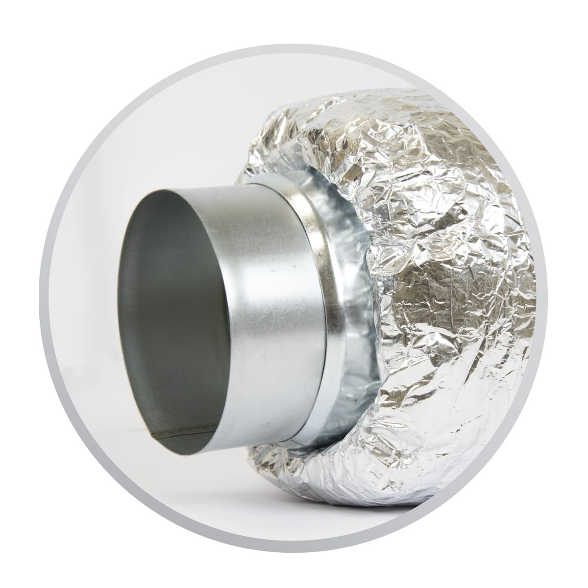 На обоих концах шумоглушителя находятся оцинкованные металлические втулки для легкого подсоединения к любому жесткому воздуховоду или вентиляционному устройству.