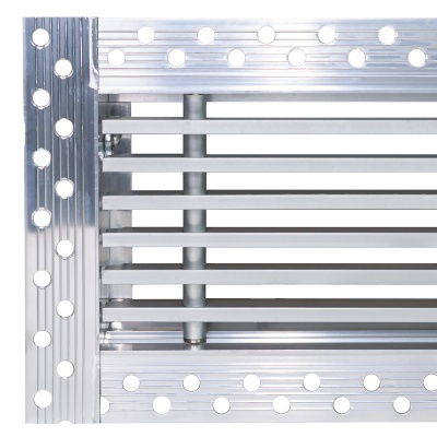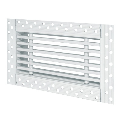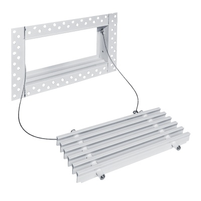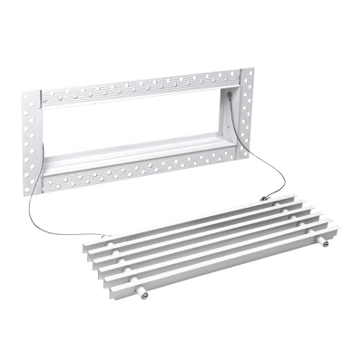 Данная решетка подходит для монтажа на любую поверхность под финишную отделку. Рамка и экран изготовлены из алюминия, опора экрана - из оцинкованной стали. Рама оснащена «полкой» 1,9 мм и рифлеными краями для большей адгезии финишного материала – шпатлевки, цемента. Решетка имеет съемную центральную часть с фиксированным углом наклона ламелей 0°. Она крепится к корпусу прочными металлическими тросиками, легко снимается для очистки и удобного обслуживания.