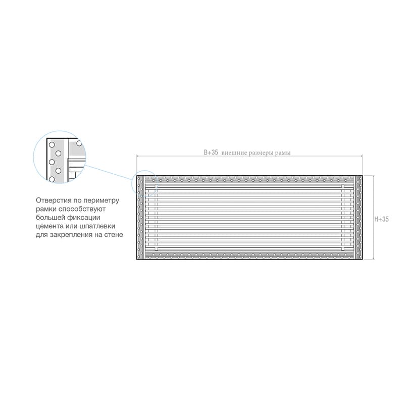 Данная решетка подходит для монтажа на любую поверхность под финишную отделку. Рамка и экран изготовлены из алюминия, опора экрана - из оцинкованной стали. Рама оснащена «полкой» 1,9 мм и рифлеными краями для большей адгезии финишного материала – шпатлевки, цемента. Решетка имеет съемную центральную часть с фиксированным углом наклона ламелей 0°. Она крепится к корпусу прочными металлическими тросиками, легко снимается для очистки и удобного обслуживания.