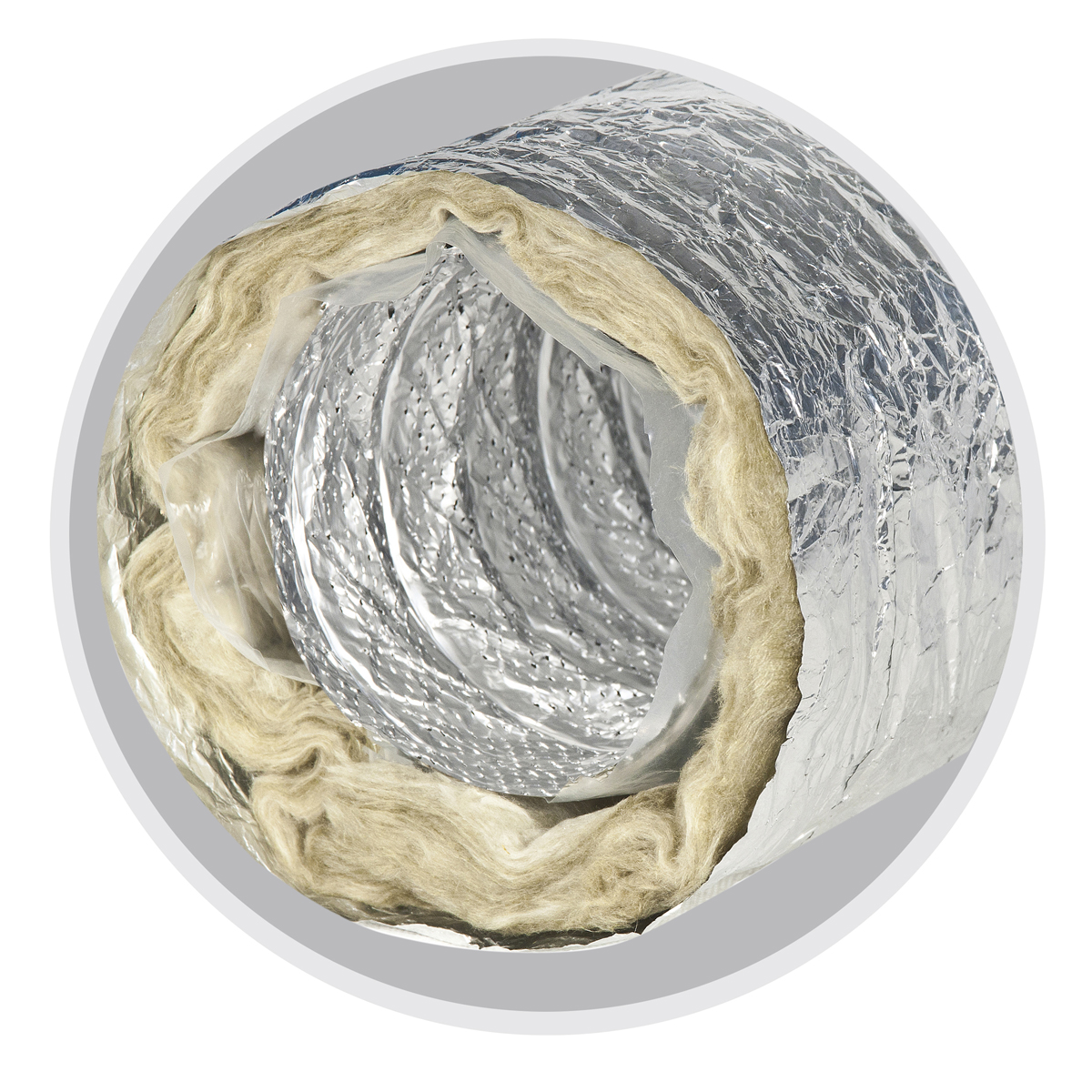 Шумоизоляционный слой без стыков, волокно имеет равномерный нахлест. При монтаже он не раскрывается, не образуются незащищенные зоны. Как следствие не ухудшается качество звукоизоляции.Наружный слой из алюминия, ламинированного полиэстером, надежно защищает изоляционный материал и внутренний воздуховод от деформации, нарушения целостности.